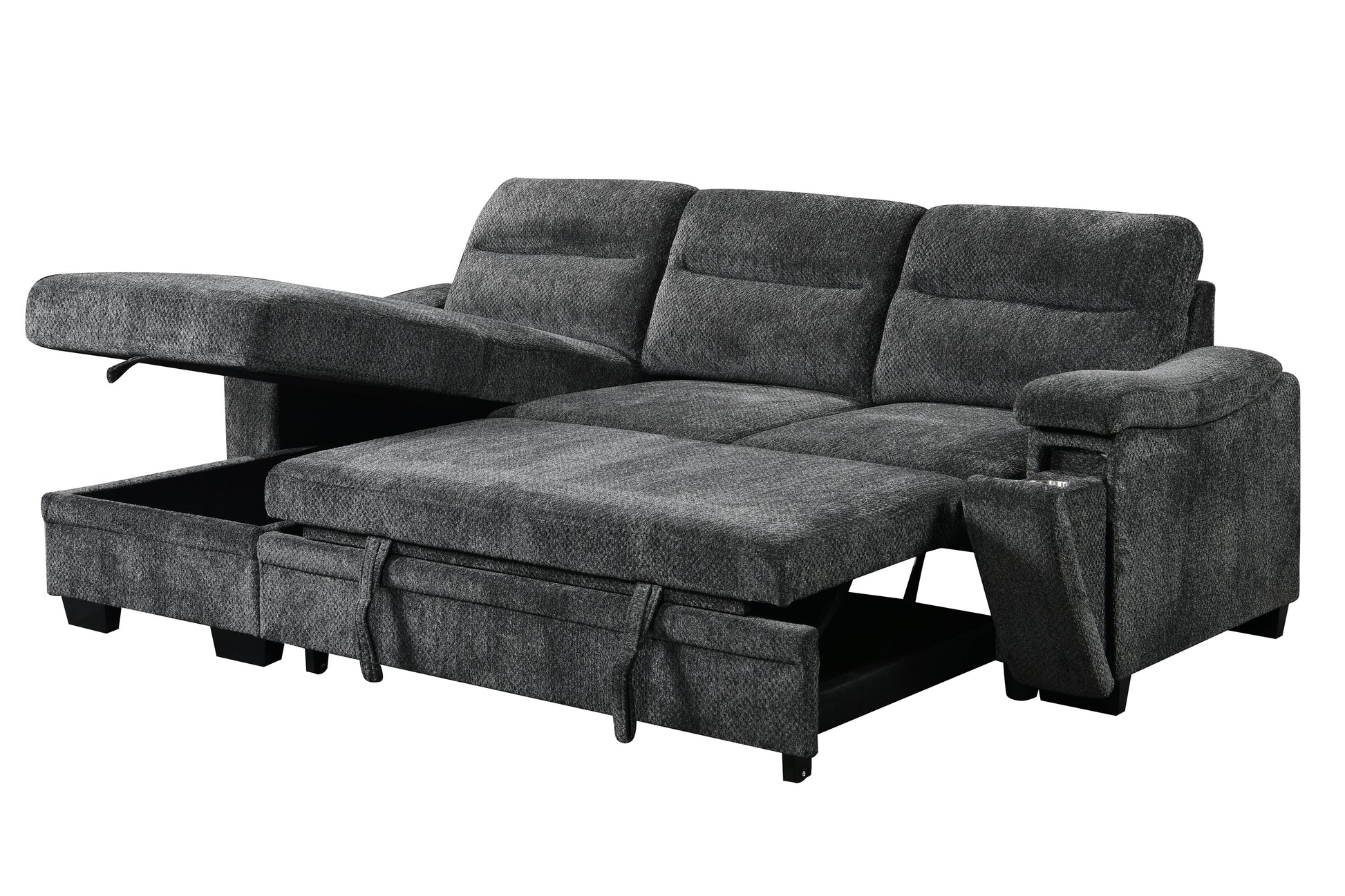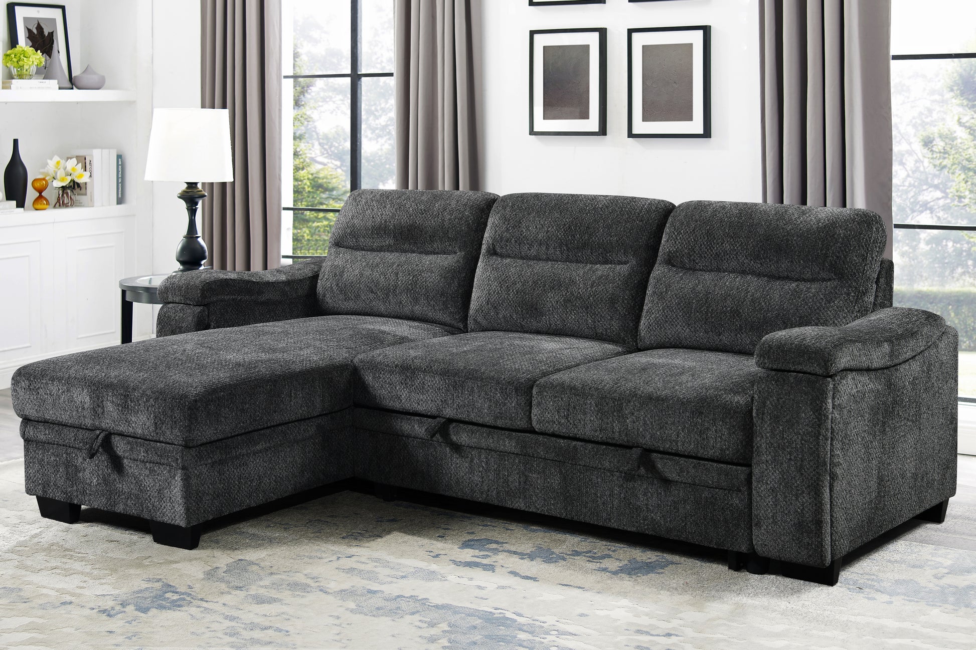 Introducing the Savio Sectional, where versatility meets comfort in every detail. Upholstered in a sophisticated gray chenille fabric, this sectional adds a touch of modern elegance to any living space. Perfect for those who value multifunctionality, it features a convenient pop-up sleeper, seamlessly transforming your sofa into an extra bed for family and guests.