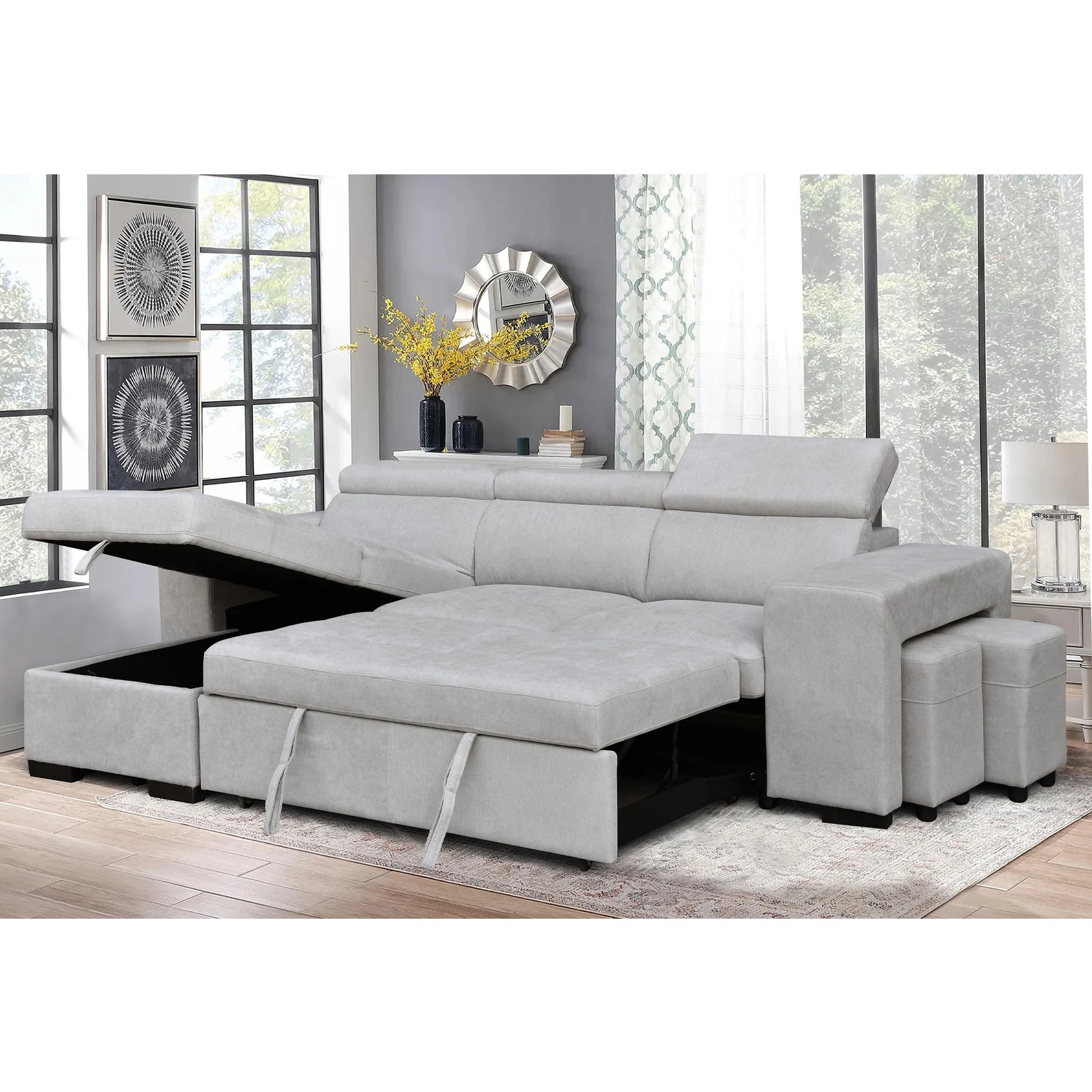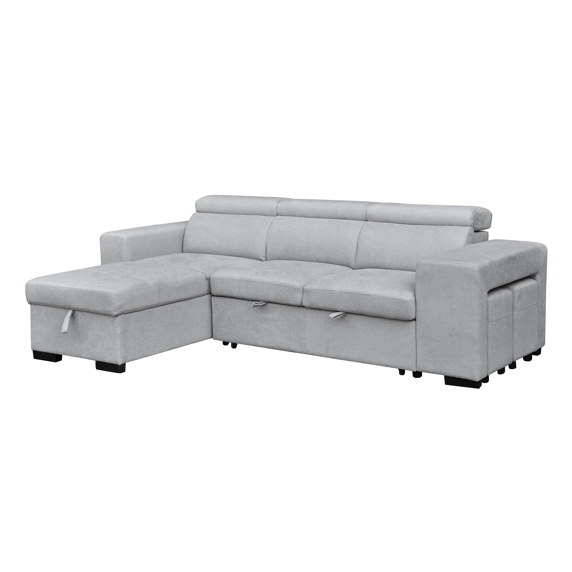 The sleeper section effortlessly pulls out, providing a comfortable space for guests to rest. Additionally, two ottomans are conveniently stored under the armrest, ready to offer extra seating or a place to prop your feet up. The colour is a light grey called Thora Stone.